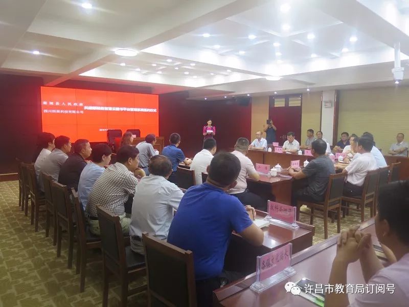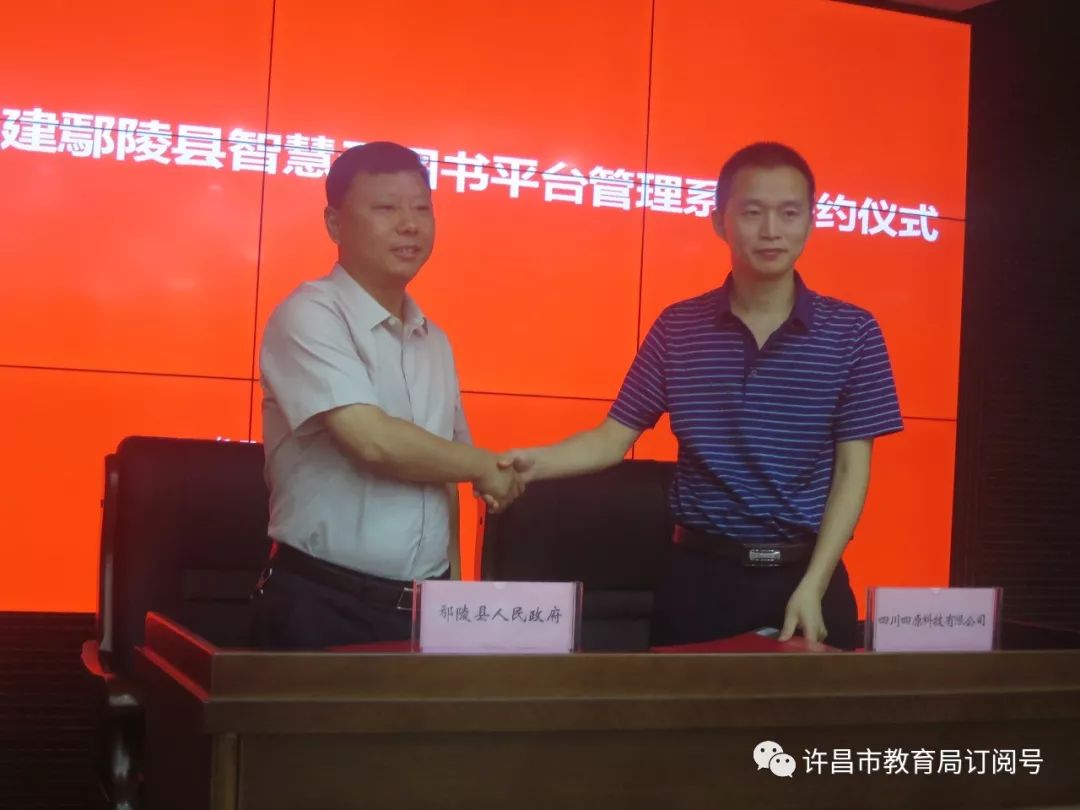 7月30日,鄢陵县人民政府与四川四原科技有限公司就鄢陵县智慧云图书平台管理系统在鄢陵县举行签约仪式。鄢陵县政府副县长靳喜民,四川四原科技有限公司总经理曾垣朝,鄢陵县政府办副主任张羽、教科局局长耿利民、文广局副局长郭新芳等出席签约仪式,人民网、大河网等多家媒体记者应邀参加,四原科技有限公司相关负责人,文广局、教科局部分班子成员,各镇文化站站长、中心校校长,县直学校校长等50余人参加仪式。