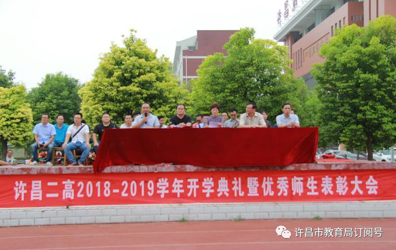 8月31日下午,许昌二高在田径场举行2018年秋季开学典礼暨优秀师生表彰大会。该校校长冶慧玲、党总支书记李国强,副校长遵卫东、张二民、张东旭及全校师生参加开学典礼,大会由张东旭主持。