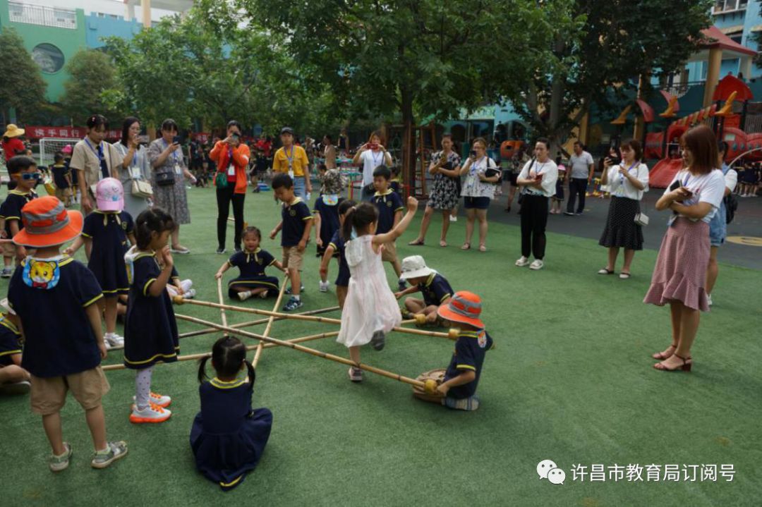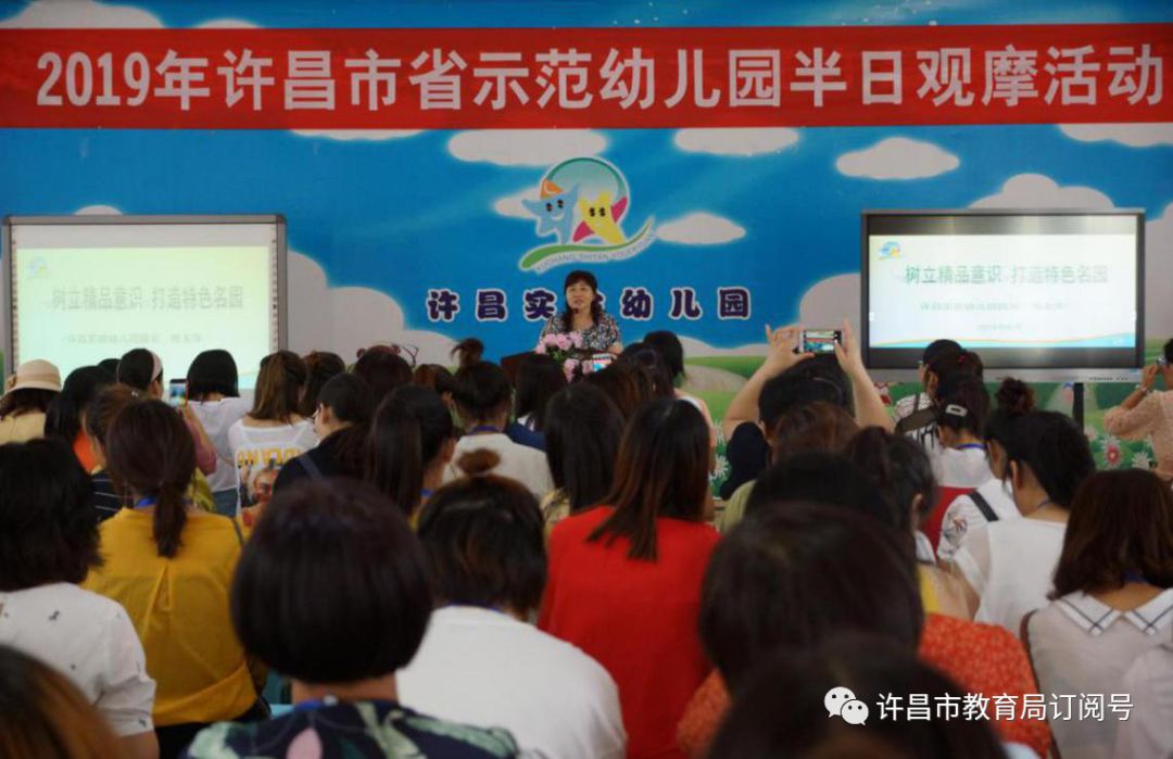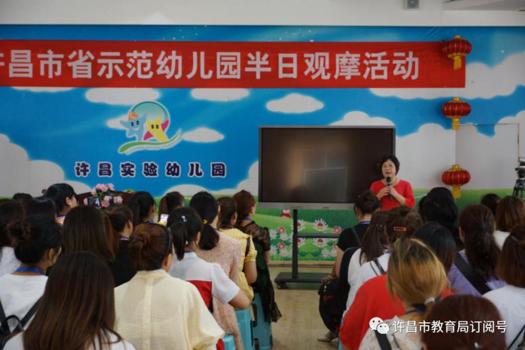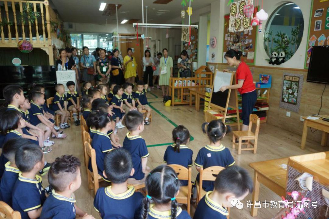 为更好地发挥省级示范幼儿园的辐射带动和引领作用,全面提高许昌市幼儿园办园水平。在许昌市教育局的组织安排下,6月19日上午,许昌实验幼儿园开展了许昌市省级示范幼儿园半日开放观摩活动。许昌市一级幼儿园以上的幼儿园骨干老师代表197人在市教育局基础教育科幼教专干张玮老师的带领下莅临许昌实验幼儿园观摩,该园副园长王花灵等班子成员陪同。