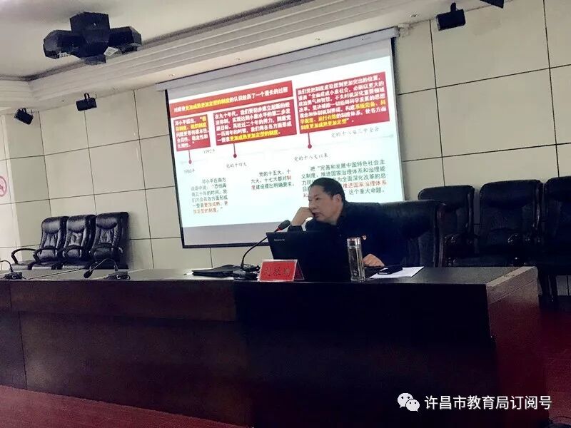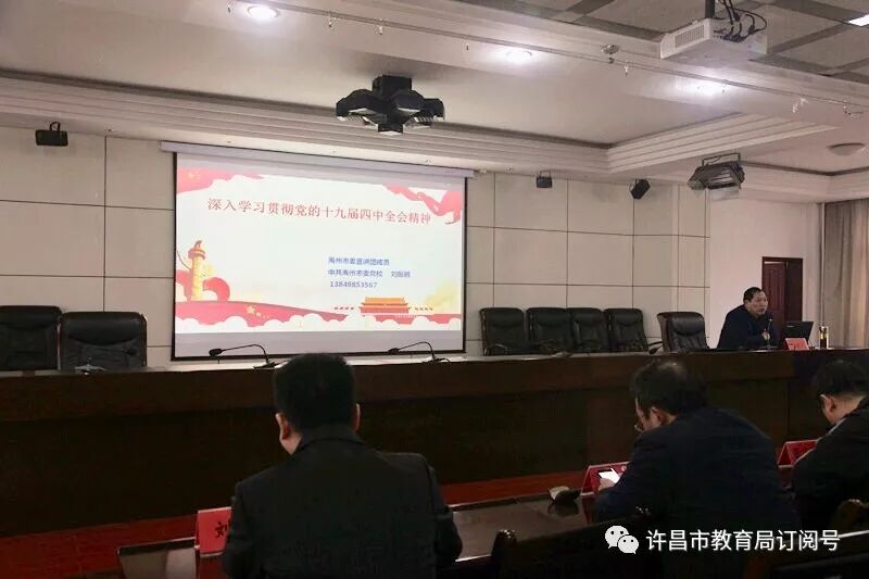 为深入贯彻党的十九届四中全会精神,按照禹州市市委统一安排部署,12月25日上午,禹州市教体局举办学习贯彻党的十九届四中全会精神宣讲报告会。报告会邀请市委第四组宣讲团刘振鹏教授为教体系统进行党的十九届四中全会精神宣讲。禹州市教体局全体班子成员出席报告会,局机关全体成员、各乡镇(办)教育党总支书记、市直学校校长参加报告会。禹州市教体局副局长刘艺主持。