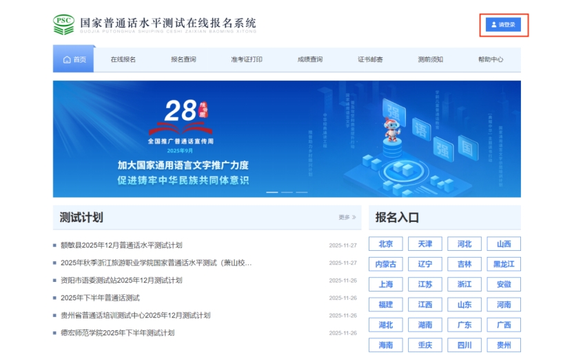 考生通过国家普通话水平测试在线报名系统(http://bm.cltt.org)报名。点击网页右上角“请登录”进行“注册”,注册后重新登录完善个人信息。