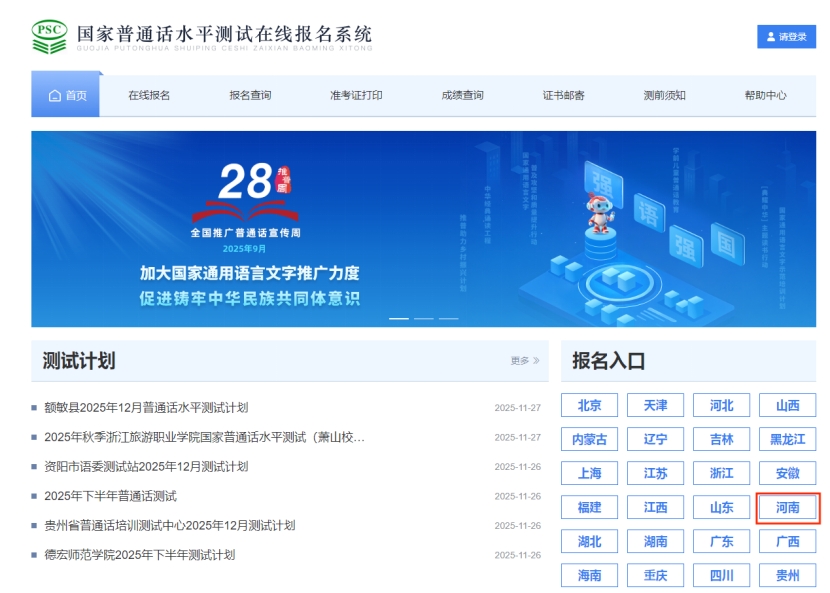 考生注册登录成功后,在首页“报名入口”一栏选择省份“河南”。进入“选择考点”页面后,选择“许昌市普通话水平测试站”,根据自身安排选择测试时间,确认无误后点击下一步完成线上报名。