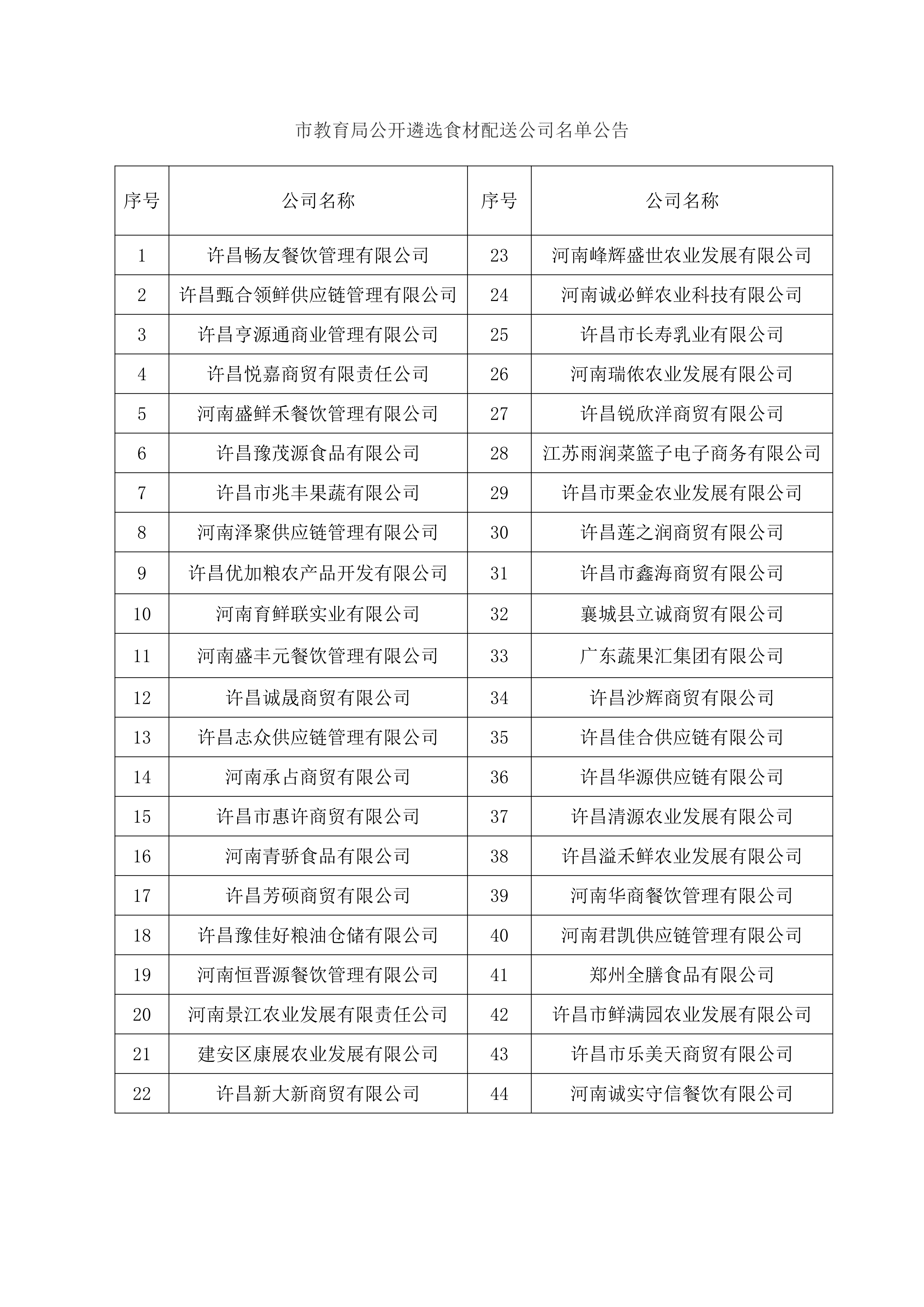【公告】许昌市教育局公开遴选食材配送公司结果公告